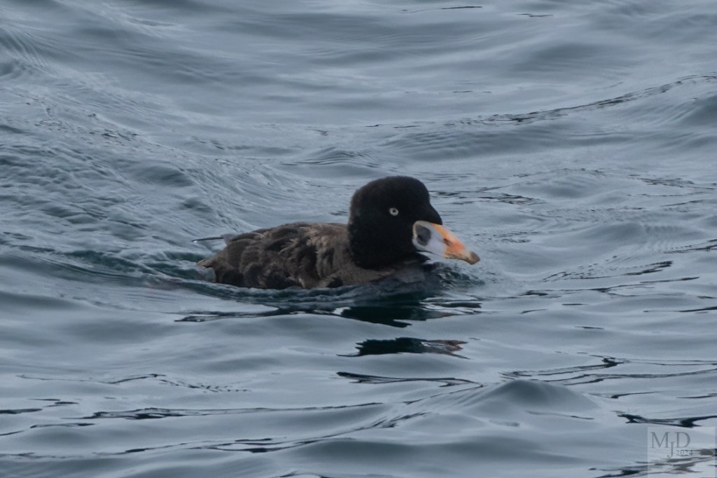 This is the third of three posts featuring the three species of scoter that winter here in New England. This is an immature male Surf Scoter photographed at Cape Neddick, Maine. As he matures, his beak will become even brighter and he will develop white patches on his forehead and the back of his head.