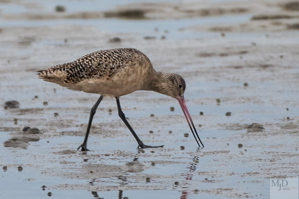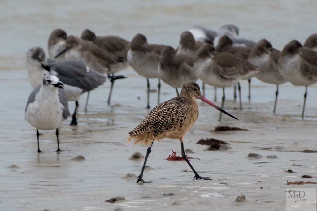 The Marbled Godwit is a large shorebird with a long, slightly upturned, bicolored bill. It uses its rapier-like bill to probe the sand for invertebrates and plants. They primarily breed in the northern prairies of the US and Canada. There two satellite breeding areas, one in southern Alaska and another at the southern end of Hudson Bay. They winter along the Atlantic, Pacific and Gulf coasts. These were photographed at San Carlos Bay in Florida.