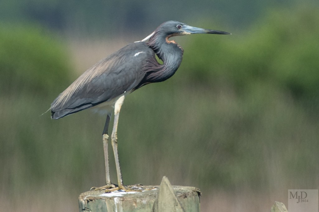 The Tricolored Heron gets its name from the combination of blue-gray, purple and white plumage. The white on the neck and underside are just visible in this photo. The little white plume on the back of the head is an elegant touch.