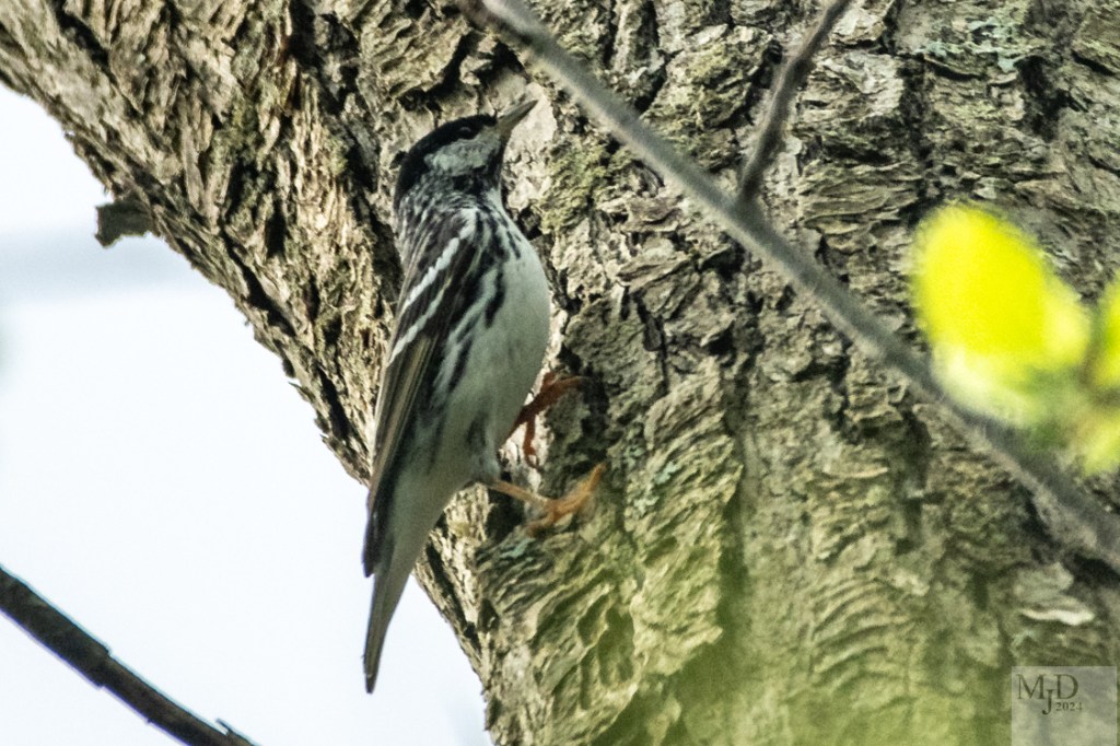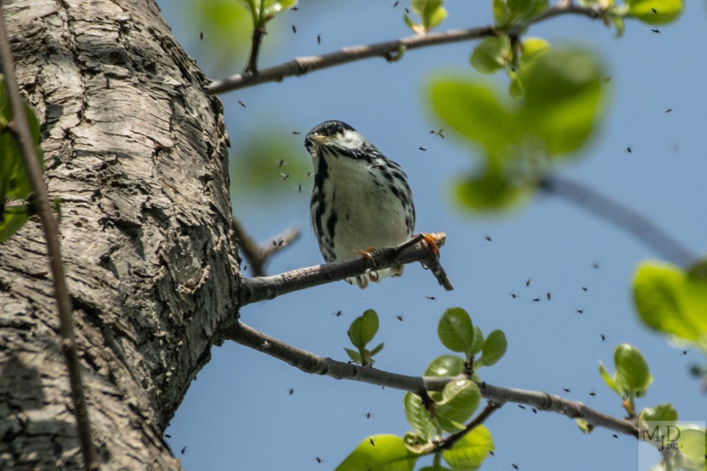 Blackpoll Warblers don’t snatch bugs from the air like a flycatcher. They pick them off the bark and leaves. This one is eying a swarm of gnats but not partaking in a snack until they land.