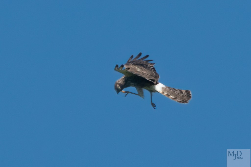 These photos were taken in northern Vermont where Norther Harriers breed. Harriers are most often observed flying low over grass or marsh land as they look and listen for small mammals that make up the bulk of their diet. However, this female/juvenile was soaring on a rising thermal like a Red-tailed Hawk and I thought it was a hawk at first glance.
