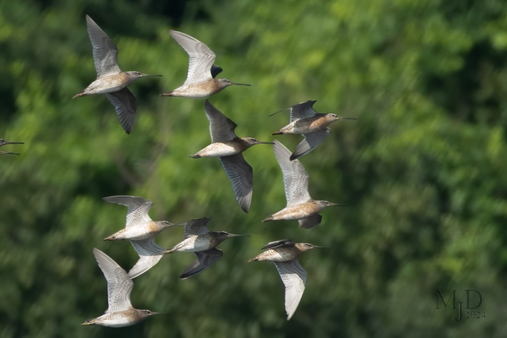 It is shorebird migration time here. This is part of a flock of Dowitchers leaving an inland pool for the river/ocean flats that were opening up as the tide was ebbing.