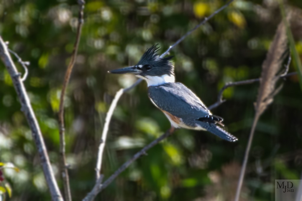 You typically hear the loud rattling call before you see a Kingfisher. And when you do see them, they are zipping along the water after their aquatic prey. The big bill and ragged crest makes them look a little top heavy. This is a female Belted Kingfisher. Males don’t have the chestnut band.