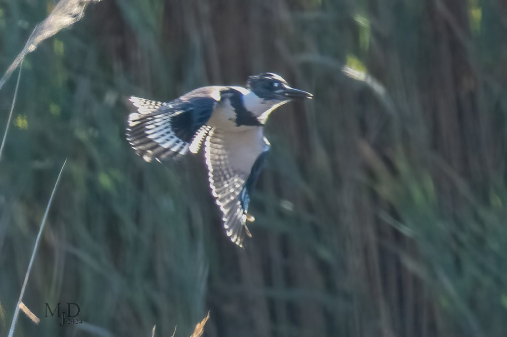 Always a tough bird to catch in flight. Their loud rattling call, usually the first thing you notice when they are around, sounds like laughter to a photographer. They zip along when patrolling their territory and have a knack for staying just out range for a photo. Thus they have the last laugh more often than not! I managed to get this one shot out of a couple of dozen or so tries as I tracked him while he flew back and forth, “laughing” the whole time.