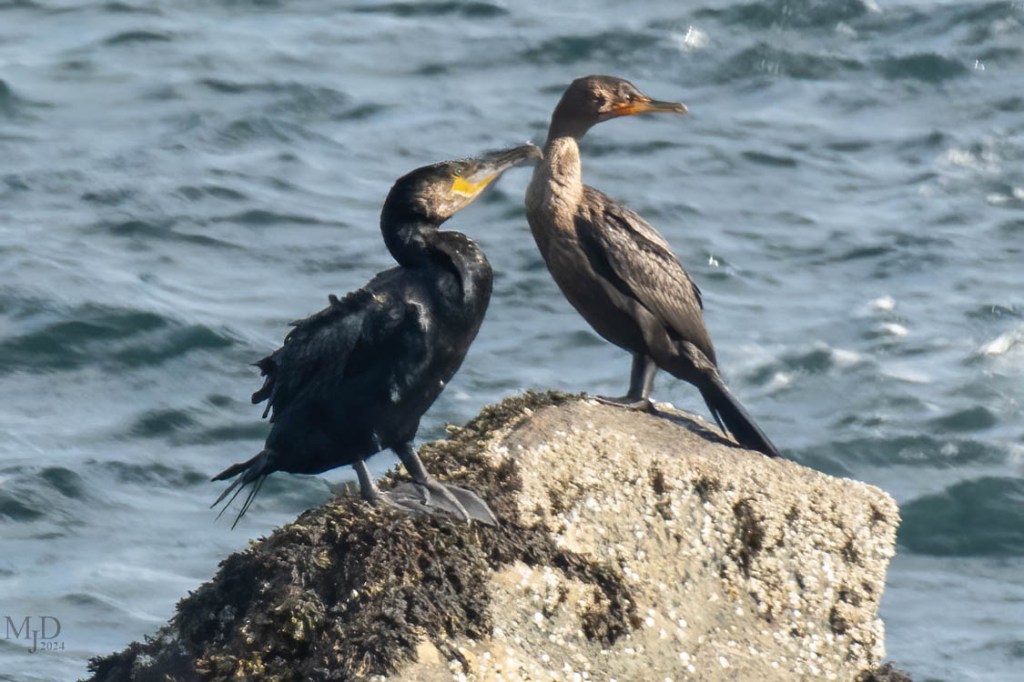 Our two species of Cormorants share a rock on a sunny morning. The larger bird on the left with the white patch in the throat is a Great Cormorant. They have a worldwide distribution but in North America they are restricted to Greenland and the Canadian Maritimes in the summer and the northeastern US coast in the winter. The smaller bird is a Double-crested Cormorant whose range is limited to North America. I live at the northern edge of their winter habitat so the two can be spotted mingling on our rocky coasts for a few months.