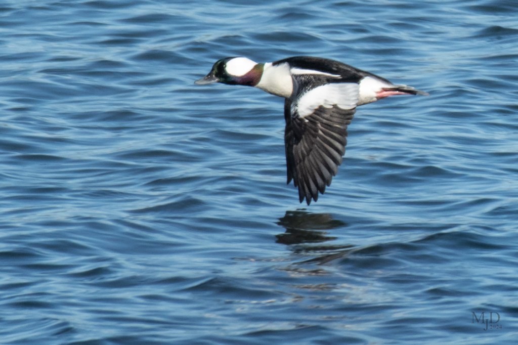 This was a Hail Mary shot. A male Bufflehead was flying over a pond with a row of trees and bushes between me and the pond. Just like going for a long touchdown pass in the waning seconds of a football game, I had to try for a lucky photo as the fast moving duck passed by openings between trees. Guess I am still pretty quick for an old guy! And a fast autofocus sure helps.