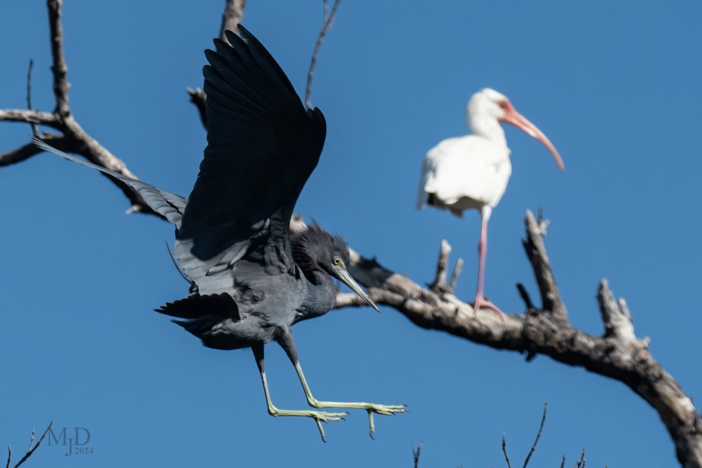This is a Little Blue Heron coming in for a landing in a roost of Egrets, Ibis and Herons. The bird in the background is a White Ibis.