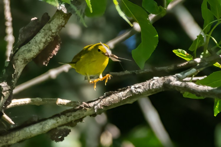 A female Yellow Warbler has captured quite a prize. She was flitting and hopping through the branches of a large tree so I think she was bringing her catch to her nest that was hidden deeper among the foliage.