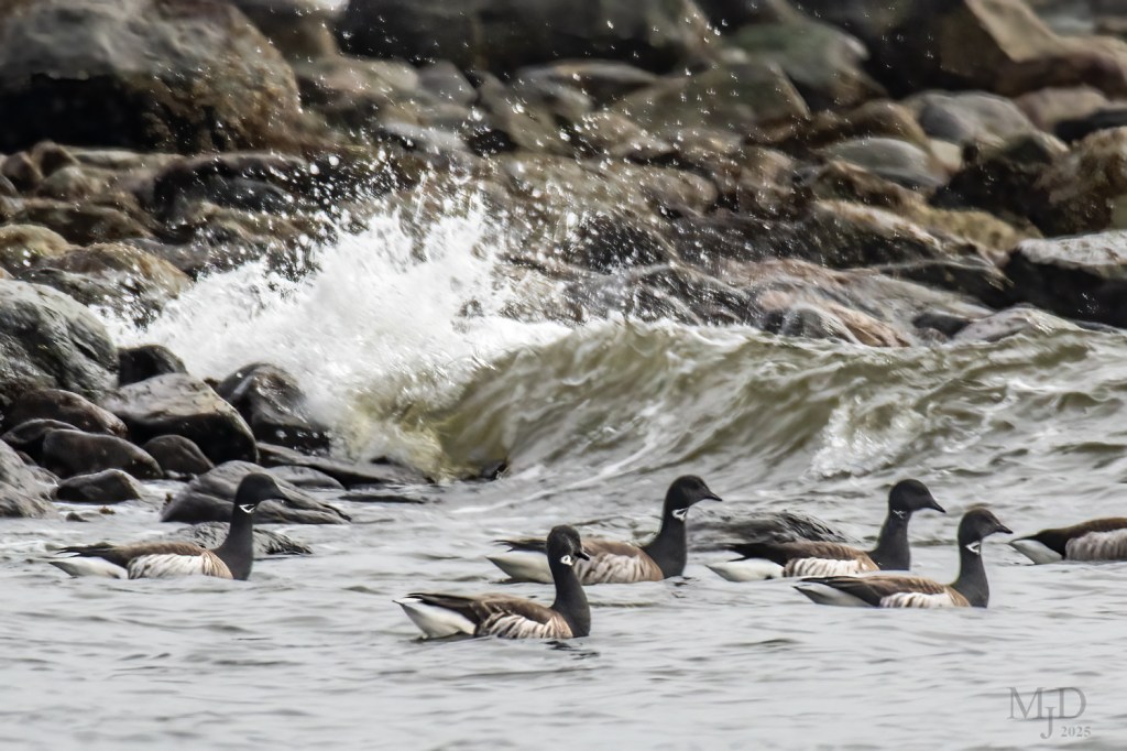 This small goose is a winter visitor to New England waters. Brants, known in Europe as Brent Geese, breed on the coast of the Arctic Ocean and winter along the Pacific Coast from Alaska to Baja California, the Hudson Bay, the Gulf of St. Lawrence and the New England coast. This small group was part of a larger flock feeding off Plum Island. They flew in and started dining on eelgrass and other sea grasses next to the rocky shore. They didn’t seem to mind the rough surf at all.