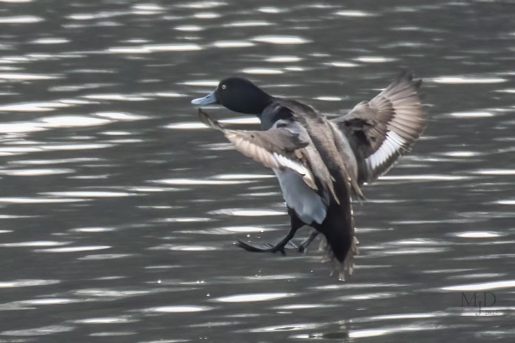 The winter range of this very abundant diving duck just barely includes the southern New England coast. They migrate as far south as Central America in fact. The closely related Greater Scaup is nearly identical but I was able to determine the species of this one once it landed and I could clearly see the shape of the head. Head shape is pretty much the only way to tell the two apart.