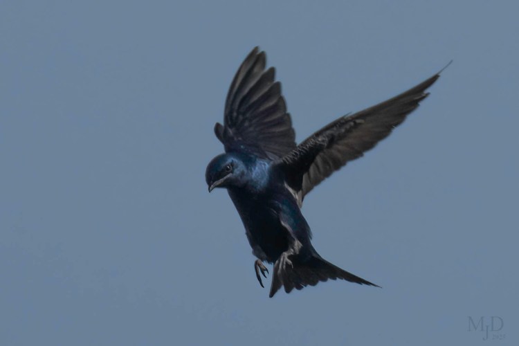Purple Martins, our largest swallows, have arrived for the summer after spending the winter in South America. The males have a very dark blue-purple body with black wings. They look all black unless highlighted by the sun. They nest in colonies and will happily utilize nest boxes made for multiple pairs. This male is part of a colony using the cluster of gourd shaped nest boxes at the entrance of the Parker River National Wildlife Refuge.