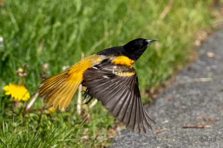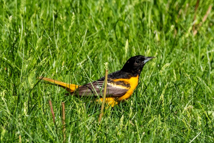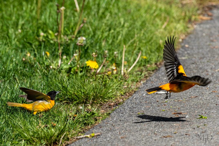One of our summer residents is the Baltimore Oriole who nests here. And nesting means territorial conflict. This first Oriole below was on the ground beneath the tree he had claimed when another male flew in. The second one did not get a chance to land before he was threatened. He flew off to find his own tree.