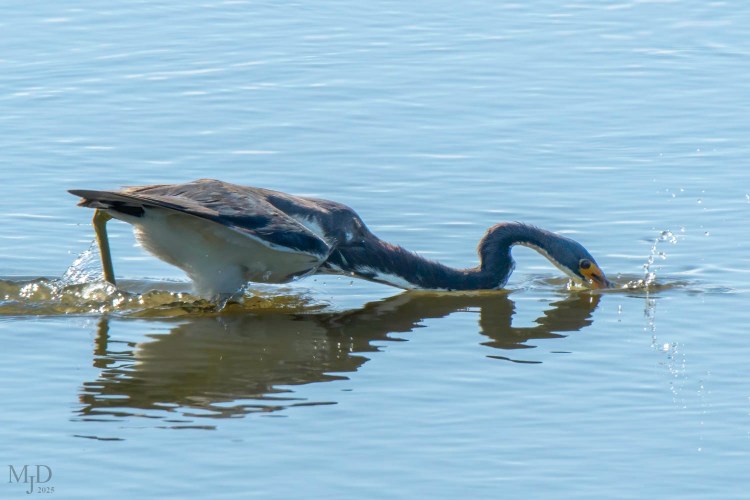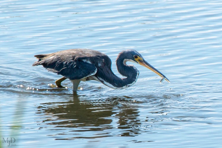 A Tricolored Heron is a fairly uncommon sight near me. They first appeared to extend their breeding range up the Atlantic Coast into Massachusetts in the 1960s but are still relatively few in number. This individual has been residing at the Parker River NWR all summer. Here it is stalking and catching small fish, neck cocked for a fast strike.