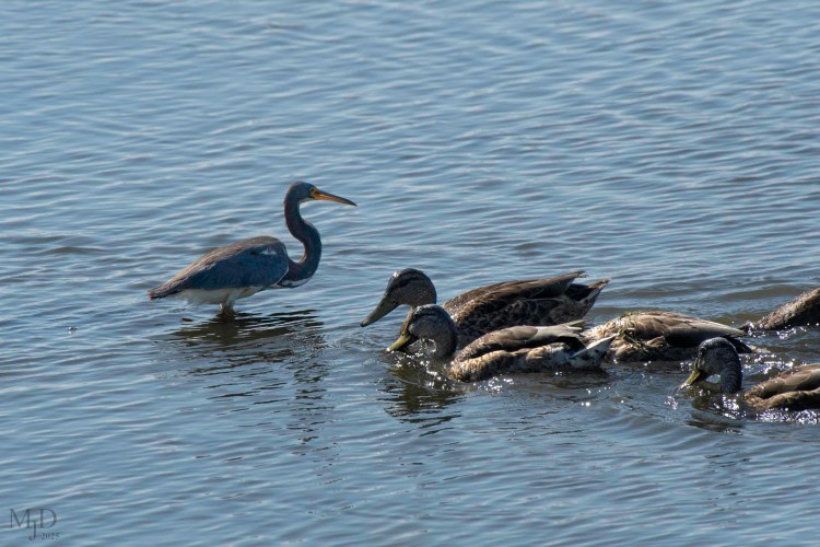 There was some competition for space as a flock of Mallards came paddling through. And a Great Egret nearly landed on top of this poor bird. It did eventually move to a quieter spot in the pond to continue peacefully fishing.