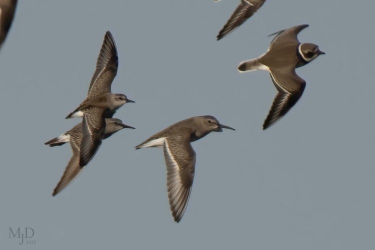 Flocks that include multiple shorebird species stop to rest and feed along the Massachusetts coast as the birds migrate from their northern breeding grounds to their warmer winter homes. This photograph of a group of birds flying across a salt panne has four different shorebirds together. On the left are a Semipalmated Sandpiper (the smaller bird) and a White-rumped Sandpiper. A Semipalmated Plover is on the upper right. A Dunlin in the center rounds out the quartet.