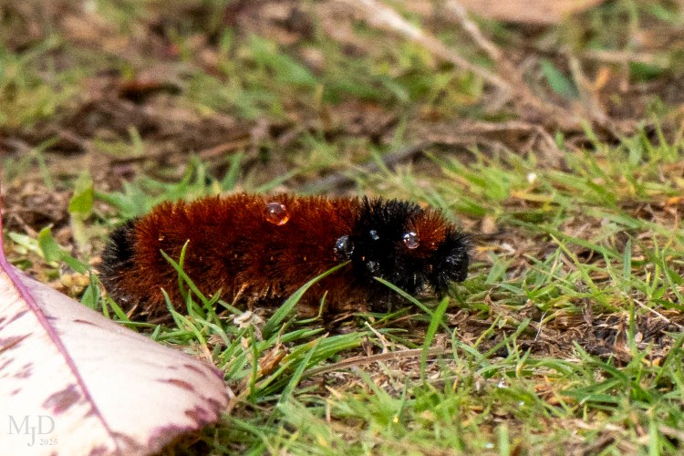 Wooly Bears are a sure sign of autumn in New England. These fuzzy black and rust colored caterpillars start appearing this time of year as they eat their fill and then find a spot to hide for the winter. They are the larva of the Isabella Tiger Moth. Folklore says that you can tell the type of winter ahead by the relative size of the rust bands. The more rust, the milder the winter. I wonder how their dubious predictions compare with the official forecasts? Sometimes it seems that the official ones are just as random! But I hope this one is right since that is a lot of rust!