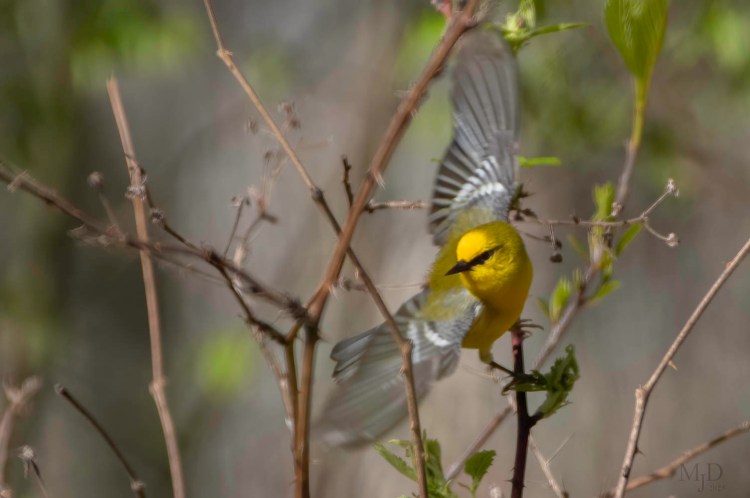 This Blue-winged Warbler is doing what it does best, fliting among the foliage to find tasty bugs.