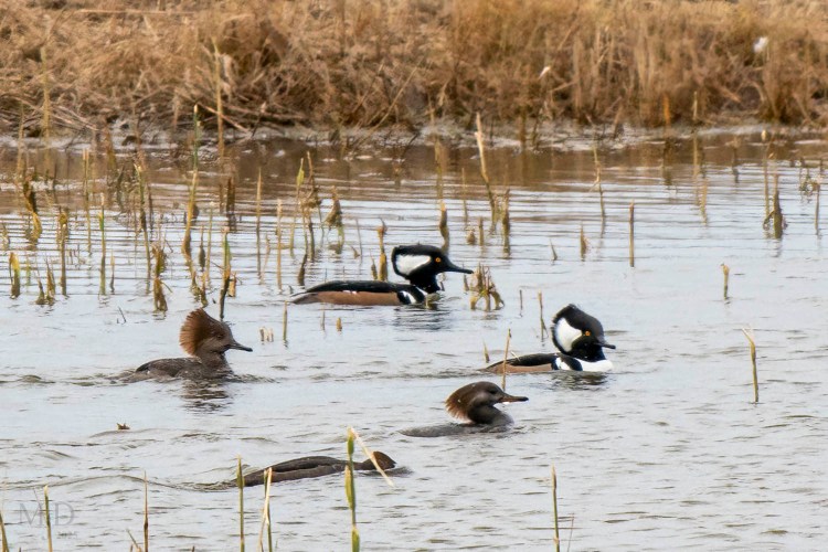 A rather large flock of Hooded Mergansers were actively pursuing a school of small fish along the edge of a pond. Swimming rapidly back and forth as a group, they continually dove for their prey as they herded the fish.