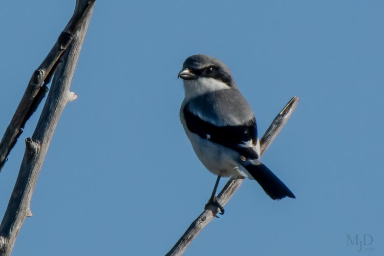 A songbird that thinks it is a raptor. It has a sharp bill that is lethal to its prey (insects, birds, lizards, small mammals) but lacks the talons of a raptor. Instead, it impales its catch on a thorn or barbed wire to make it easier to eat its meal. Loggerhead Shrikes have the unpleasant nickname “Butcherbird” as a result. It’s a ferocious little bird for its size (8in/20cm).
