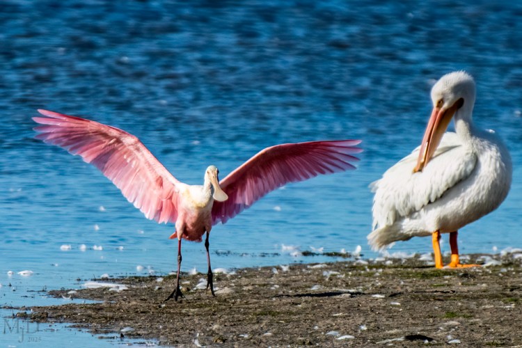 The Roseate Spoonbill is noted for its pink color and spatula shaped bill. It uses the bill to sweep back and forth, snatching up small fish and invertebrates. This one has just dropped in to join a large group of White Pelicans on a sand bar.