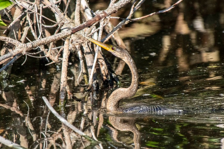 They chase fish while submerged and their bodies are always low in the water. The serpentine head and neck are all that is visible at a distance when they are swimming on the surface. I once heard someone exclaim “Is that a snake?!?” You can understand the question when you look at this female swimming close to the branches near the edge of the pool.