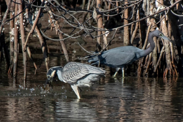 Two wading birds fishing together. The Yellow-crowned Night Heron has snatched a fish while the Little Blue Heron keeps searching.