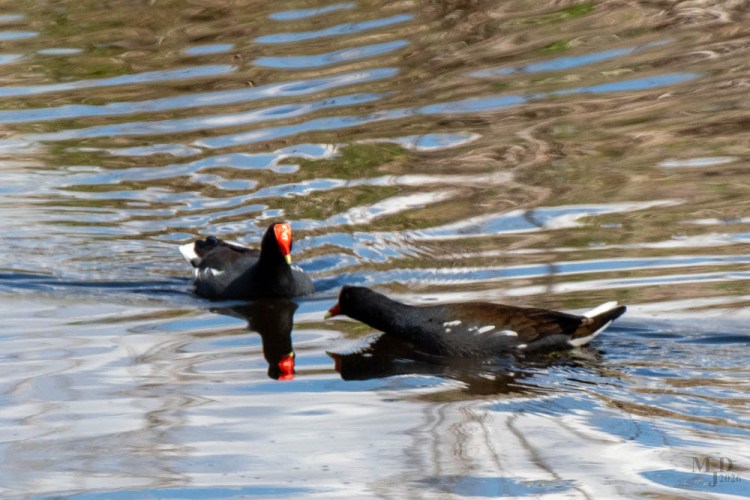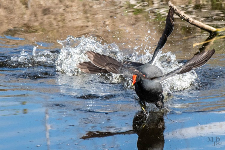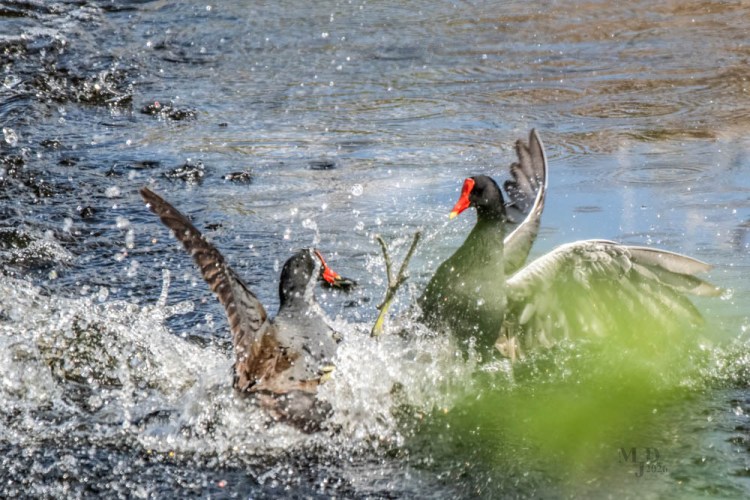 Common Gallinules become very territorial during mating and breeding season. Here two males approach each other while displaying their white tail feathers. What starts as a stare down ends up as a bit of a brawl.
