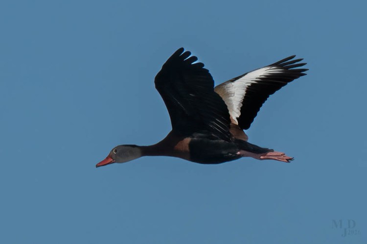This in-flight photo of a Black-bellied Whistling Duck shows all the markings for this colorful duck. There are the pink-red bill, long pink legs, gray face, chestnut body, black belly and big white wing patches. The head is held low while flying, giving the duck a kinked look.