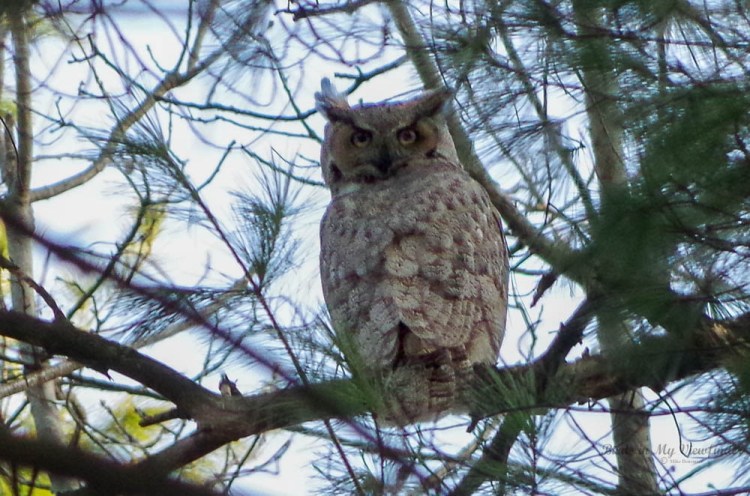 This was buried deep in the files. Great Horned Owls are often heard at night near my home but are rarely seen during the day. This photo was taken 10 years ago when some Ravens flushed this Owl. I grabbed my camera for a quick shot before he flew further into the woods to escape his harassers. Very owlish pose as he turned his head 180 degrees to stare at me.