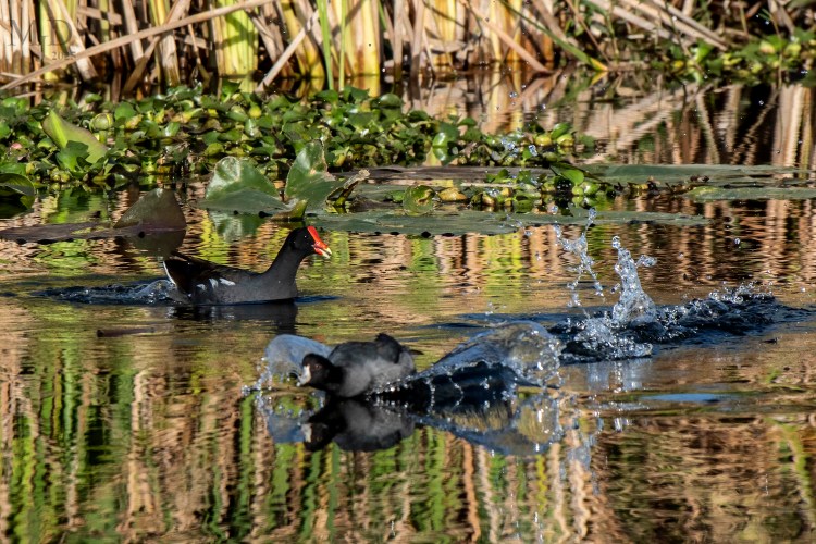 I saw many Common Gallinules and American Coots on a Florida trip. They always seemed to peacefully coexist except in this case. This Gallinule took exception to the Coot for some reason and the Coot beat a quick retreat.