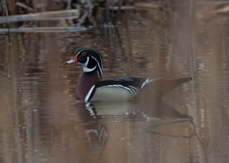 This was a tough shot. It was a dark morning with low clouds and mist and the Wood Duck was behind a lot of reeds. You can see the blur caused by some out-of-focus reeds in the foreground. Wood Ducks are easily spooked so the reeds helped screen me as I approached for the photo.